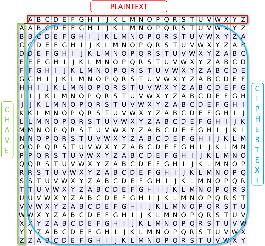A tabela a seguir é utilizada para facilitar a encriptação e a decriptaçao, dado um plaintext e uma chave.