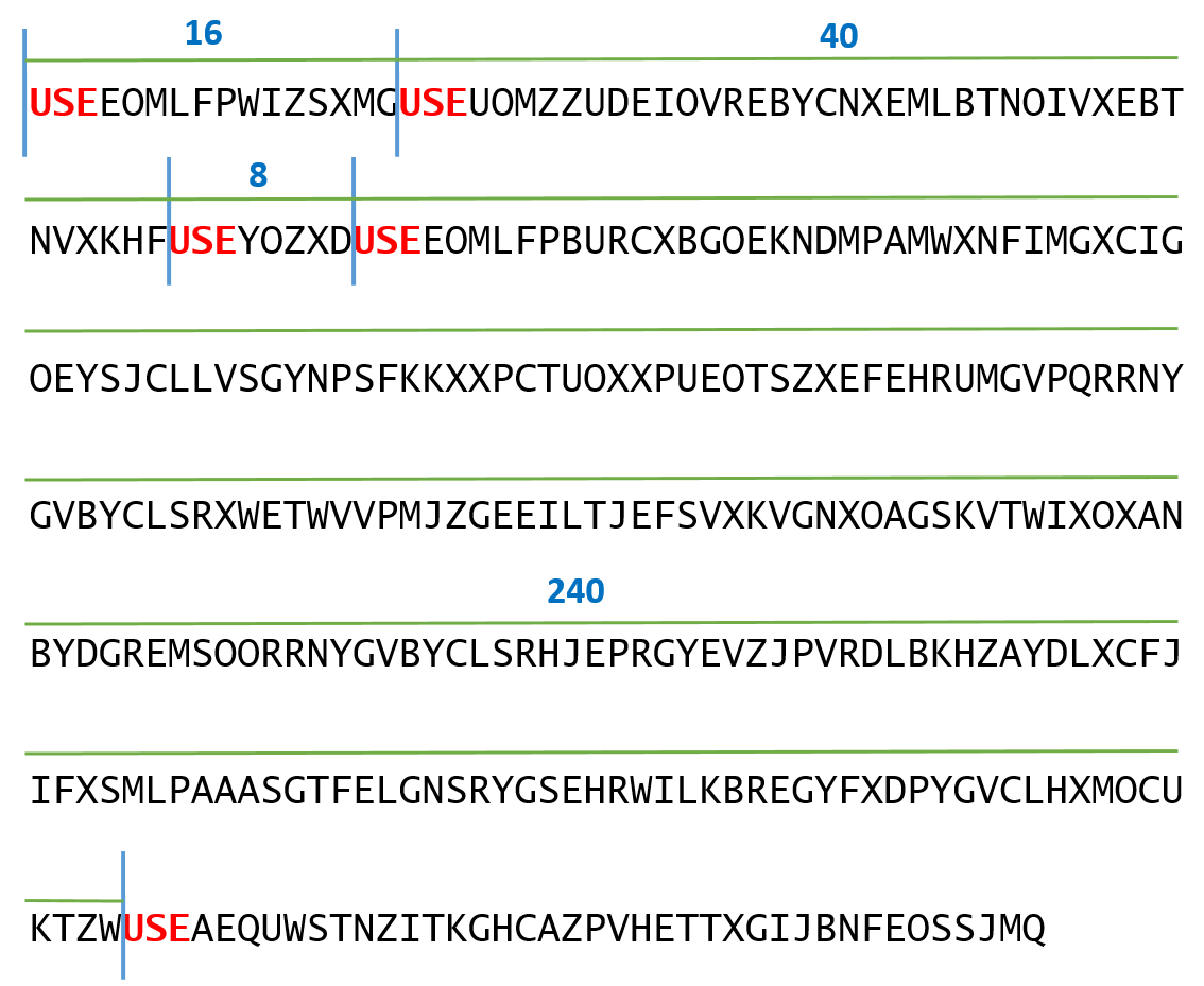 Observe a imagem com o ciphertext a seguir e repare na repetição da sequência U-S-E diversas vezes ao longo do texto.