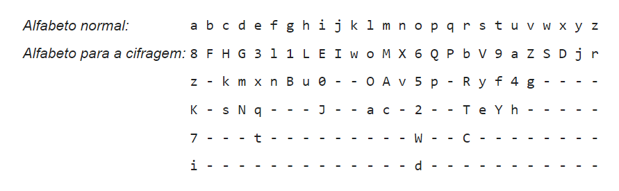 Alfabeto do plaintext: A|B|C|D|E|F|G|H|I|J|K|L|M|N|O|P|Q|R|S|T|U|V|W|X|Y|Z