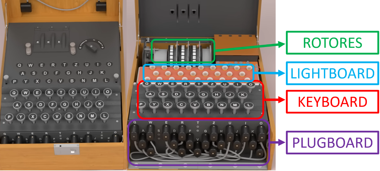 Criada para substituir os métodos "papel e caneta" que eram utilizados até então, a Enigma foi amplamente utilizada pela Alemanha nazista na Segunda Guerra Mundial. Sua quebra teve um grande impacto na história da guerra e na história da computação. Para entender o funcionamento da Enigma, precisamos olhar por dentro para identificar as quatro principais regiões da máquina.