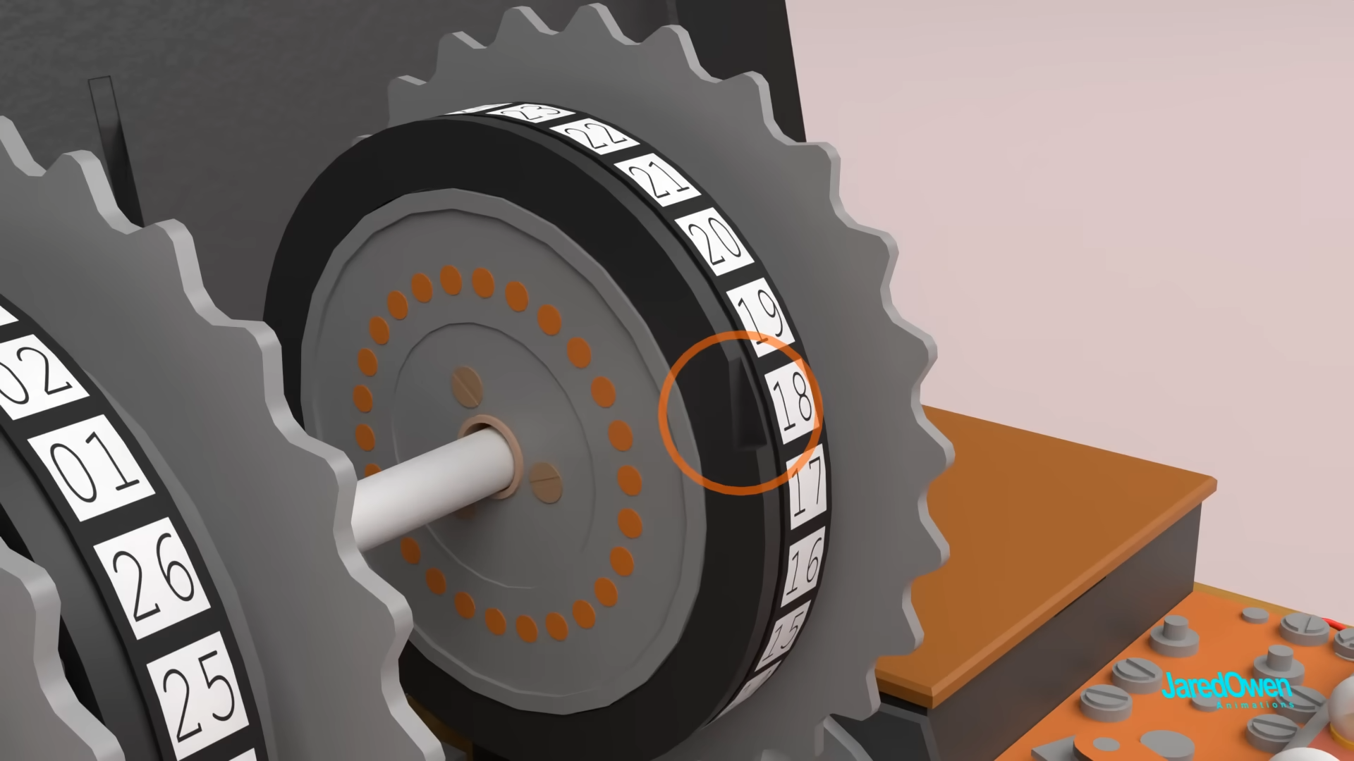 Pressionar uma tecla faz com que o primeiro rotor rotacione uma posição. Como são três rotores em série o simples fato de o rotor girar uma posição faz com que o mapeamento de letras mude completamente. Além disso, o anel de cada rotor possui um entalhe que serve para definir quando ele vai provocar uma rotação no rotor à sua esquerda. Posicionar esse entalhe no número 18, por exemplo, faz com que quando esse número alcança a parte de trás da máquina, o rotor à esquerda rotaciona uma posição, e a partir daí, a cada ciclo de 26 teclas pressionadas o primeiro rotor completará uma volta completa, fazendo com que o segundo rotor rotacione uma posição. Quando o entalhe do segundo rotor alcança a parte de trás da máquina, o terceiro rotor rotaciona uma posição, e a partir daí, a cada volta completa do segundo rotor (26x26 = 676 teclas pressionadas) o terceiro rotor ira rotacionar mais uma posição. A imagem a seguir mostra o entalhe do primeiro rotor posicionado no número 18.
