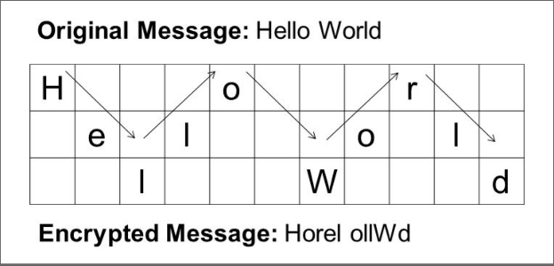 Na cifra Rain Fence, o plaintext é escrito para baixo diagonalmente em "trilhos" sucessivos de uma cerca imaginária, movendo-se para cima quando o trilho inferior é alcançado, e para baixo novamente quando o trilho superior é alcançado e assim por diante até que todo o plaintext seja escrito. O ciphertext é então obtido lendo-se por linhas. A imagem a seguir mostra um exemplo para três trilhos.
