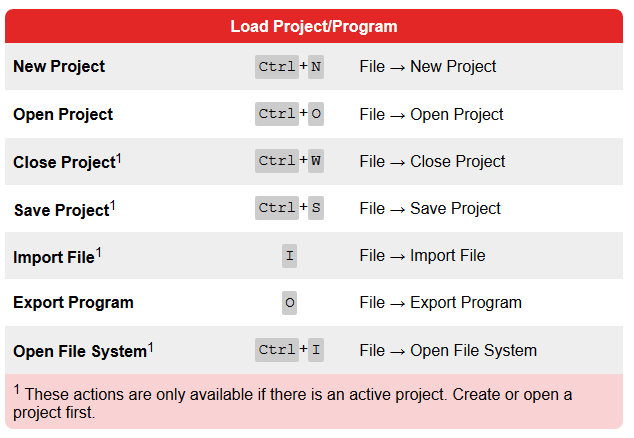 Essa tabela apresenta as hotkeys para criar, abrir e salvar projetos, além de importar e exportar binários.