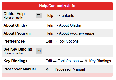 Essas são as hotkeys para alterar configurações do ghidra, além da hotkey para o Help, que tem informações e explicações de como utilizar o ghidra.