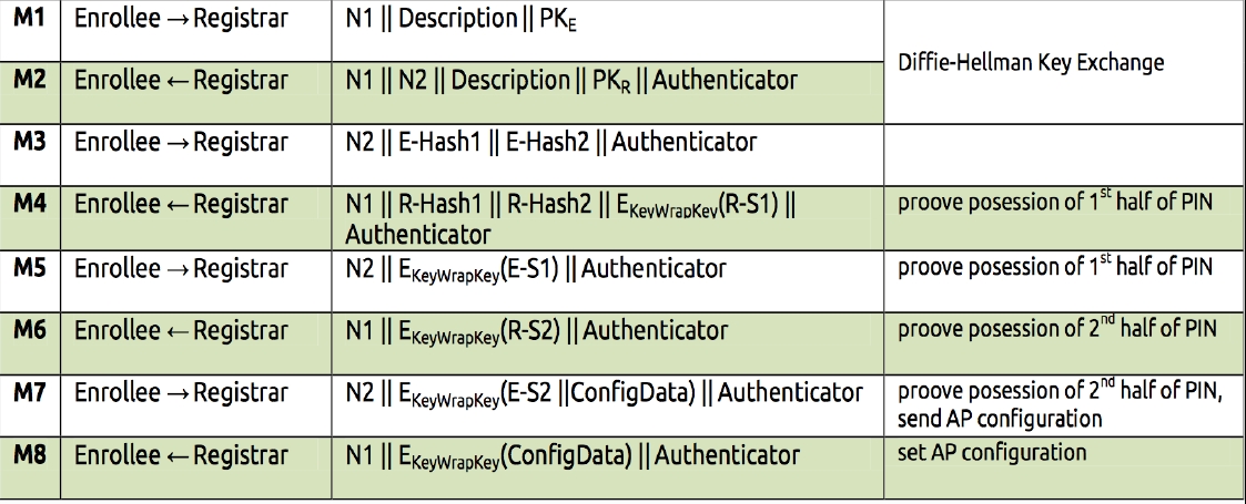 Na mensagem M1, que o Enrolee envia para o quem quer se conectar, um número (Nonce) é passado. E na mensagem M3, é enviado E-Hash1 (hash para a primeira mensagem do pin) e a E-Hash2 (hash para segunda metade do pin).