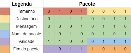 No exemplo abaixo, mostramos como um protocolo descreve um pacote de dados. Cada conjunto de bits do pacote representa alguma informação para compreender aquilo que está sendo transmitido.
