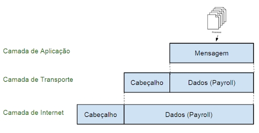 Para cada protocolo, ele considera o pacote recebido como "data" e aplica um cabeçalho(header) do protocolo em cima do pacote, sem comprometer sua integridade. Na medida que o host receptor vai recebendo os pacotes por cada uma das camadas, o header relativo a ela é interpretado e retirado do pacote. Isso se chama desencapsulamento e é semelhante a uma cebola sendo descascada de cada uma das suas camadas.