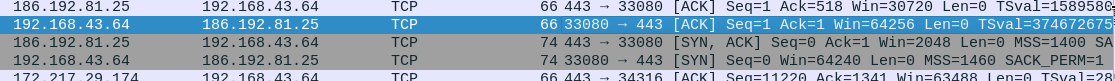 O cliente (192.168.43.64) então confirma a solicitação de sincronização (SYN) para o servidor (186.192.81.25). Esta confirmação parte da porta 33080 com destino a porta 443, com número de sequência 1 (Seq=1).