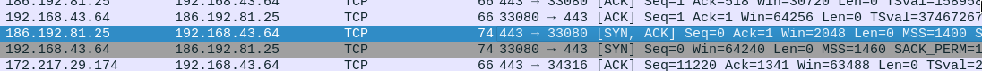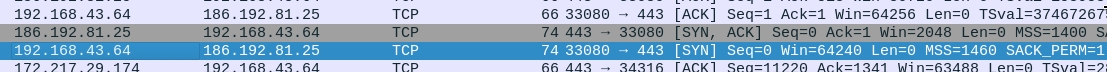 O cliente (192.168.43.64) envia uma solicitação de sincronização (SYN) para o servidor (186.192.81.25). Esta solitação parte da porta 33080 com destino a porta 443, com número de sequência 0 (Seq=0).